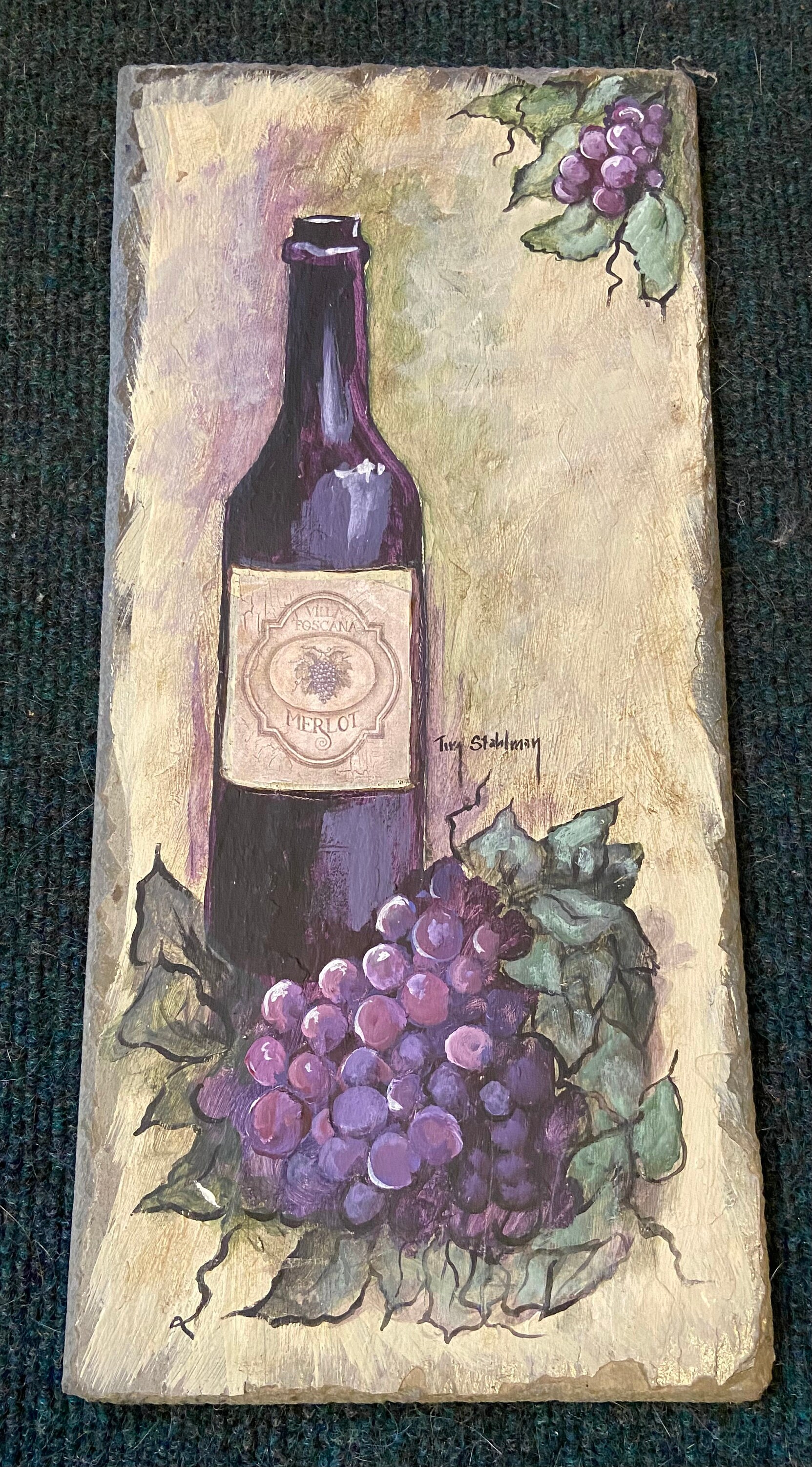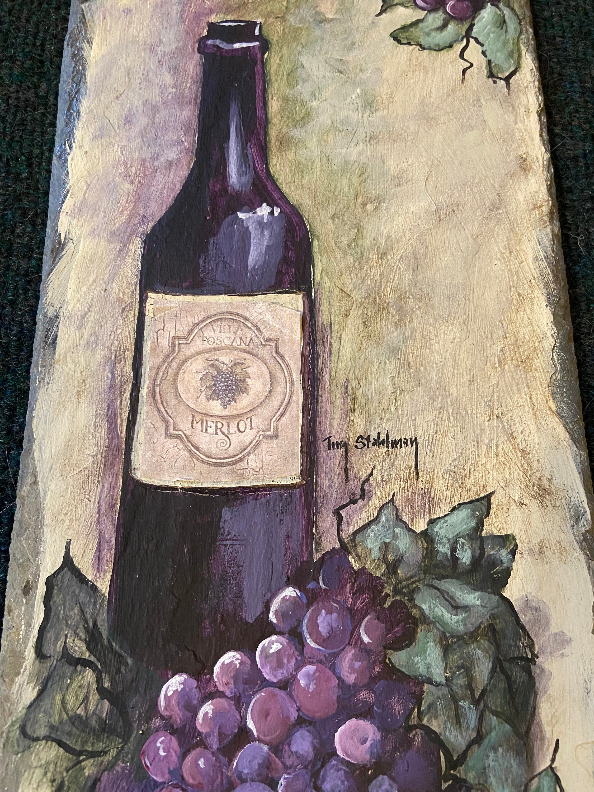 Wine bottle painting on vintage roof slate, great for Tuscan decor in kitchen or dining room. Comes with a leather cord for hanging. Size is approximate as all slates are slightly different. This is a Print from the original painting by award winning artist Tim Stahlman. Ideal gift for wine lovers!
