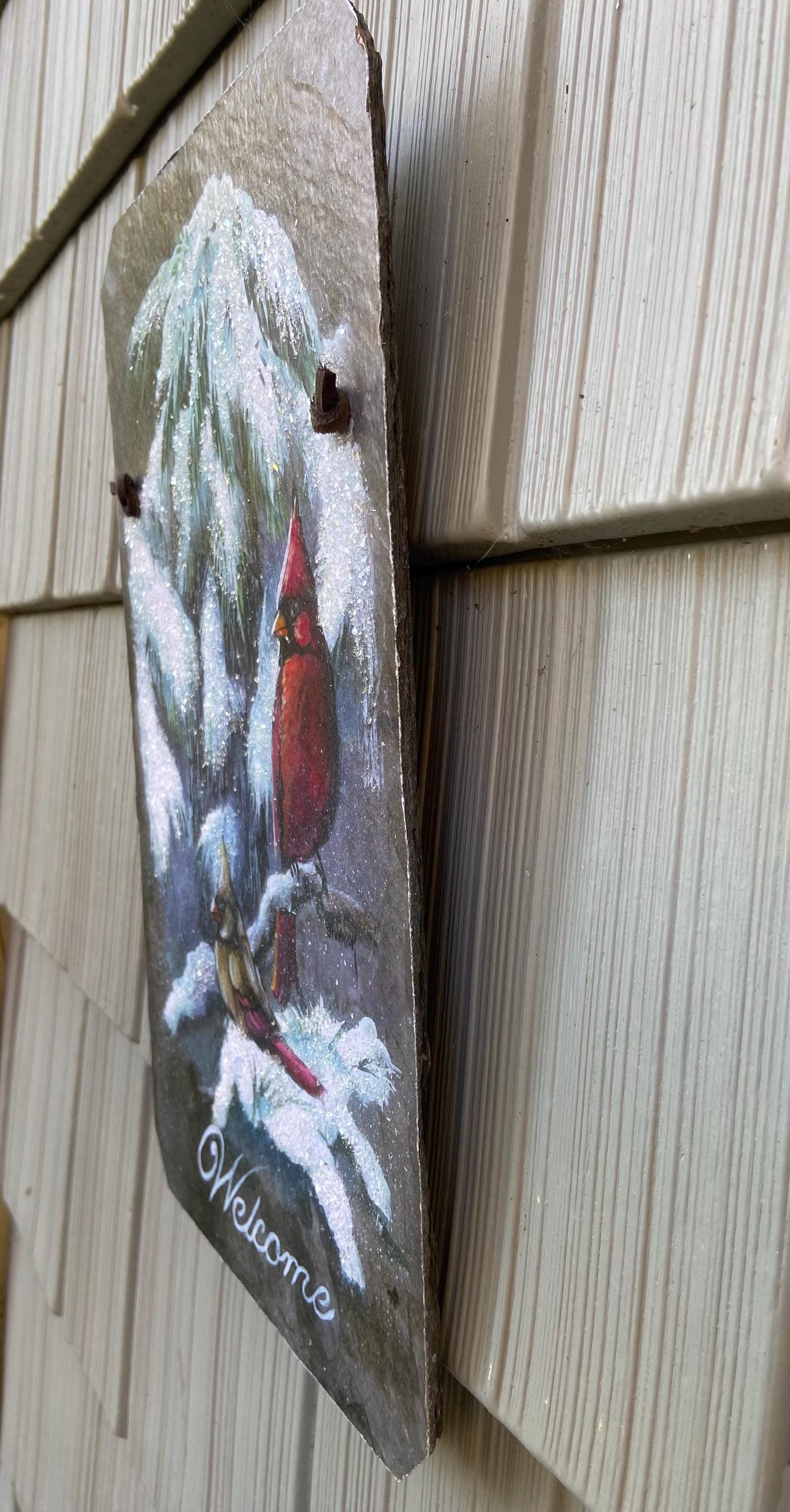 Cardinal slate painting print from the collection of award winning artist Tim Stahlman, colorful cardinal pair on a snowy branch which gives nice contrast. A winter welcome sign, a gift for bird lovers, wall hanging, welcome sign, country décor, rustic decor, wildlife décor, porch décor, A unique slate for those who love cardinals!